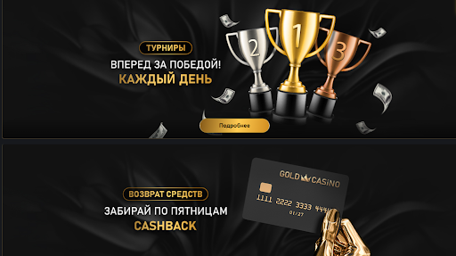 Кэшбэк от Голд казино получают все пользователи из России и других стран СНГ, достигшие четвертого уровня программы лояльности со статусом “Опытный”. На этом этапе игровая площадка еженедельно возвращает активным игрокам 2% проигранных средств. Высшие уровни приносят пользователям повышенный размер кэшбэка. «Короли удачи» получают 25% кэшбэка от клуба. Просмотреть сумму начисленного возврата можно в личном кабинете, раздел «Бонусы». Возвращение начисляется каждую пятницу.
